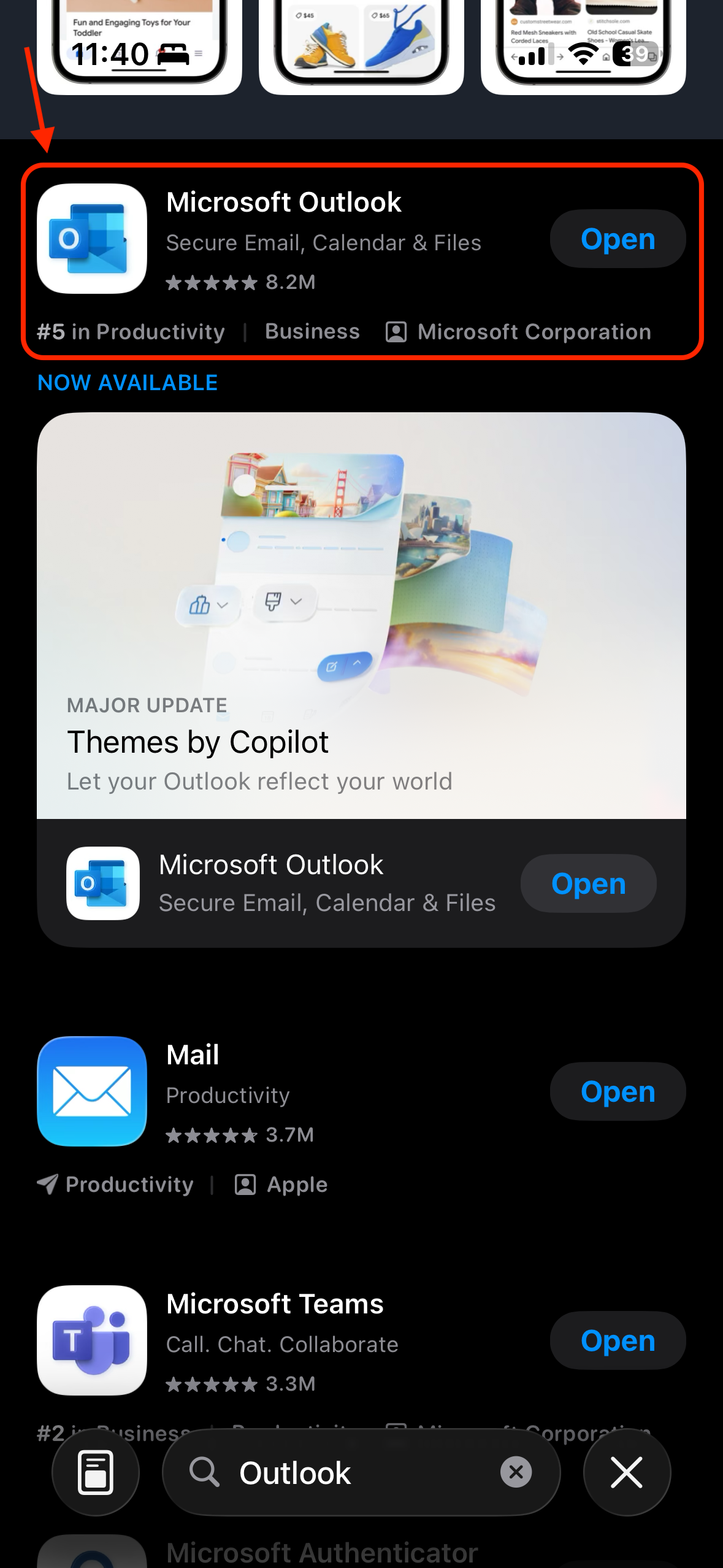 - Open the App Store, search and download the Outlook app. Ensure the developer is the Microsoft Corporation. Direct Link: https://apps.apple.com/us/microsoft-outlook/id951937596.