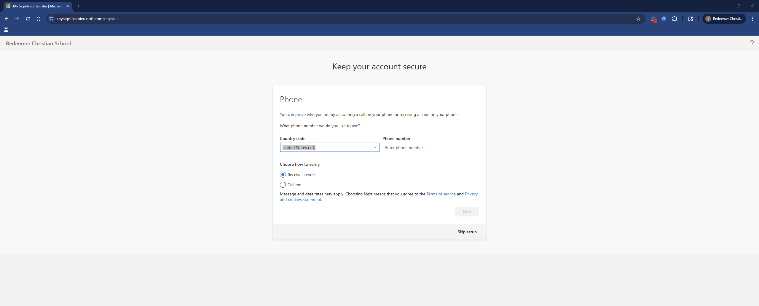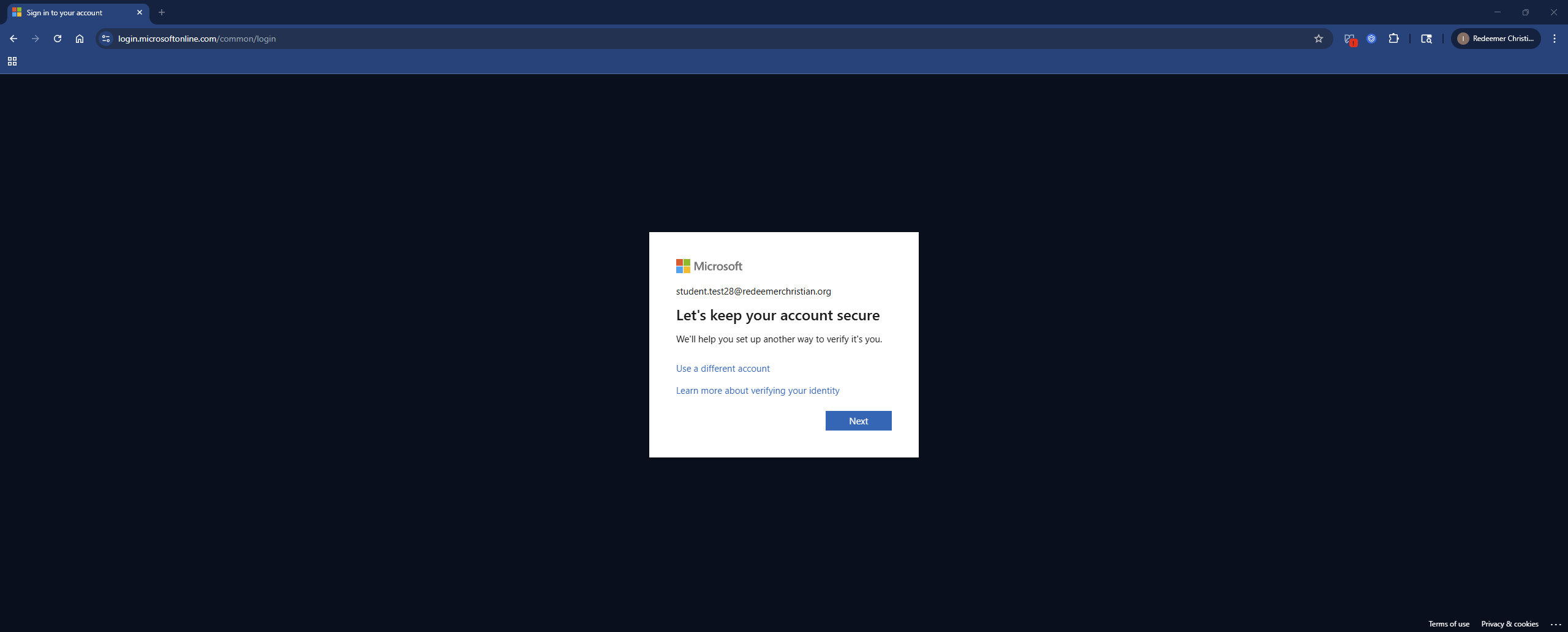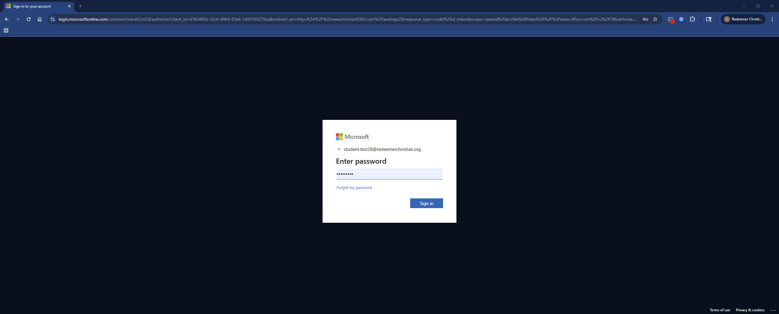 Naming convention is: first.last30@redeemerchristian.org, where first is your student first name, last is student last name, and the last two digits of your graduation year. In this example it is 2030.