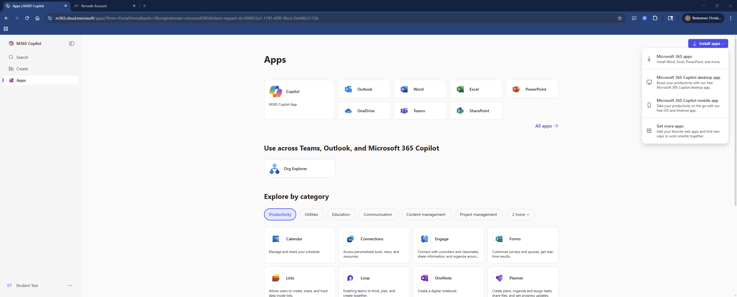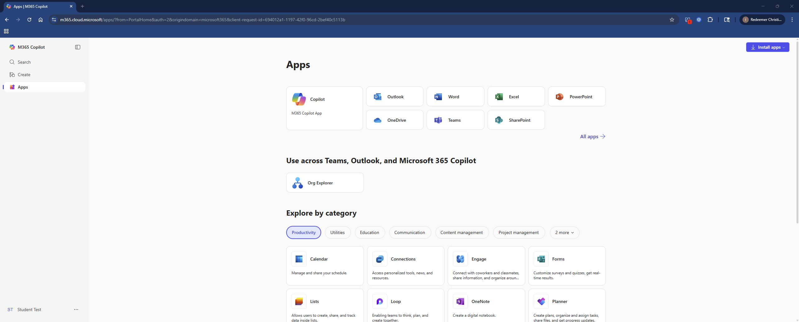 - Your student license allows you web access to Office365 apps via a browser. Click on Apps in the upper-left menu. If your student license allows, you can also install Office apps by clicking on the upper-right corner and selecting Install apps, then Microsoft 365 Apps.
