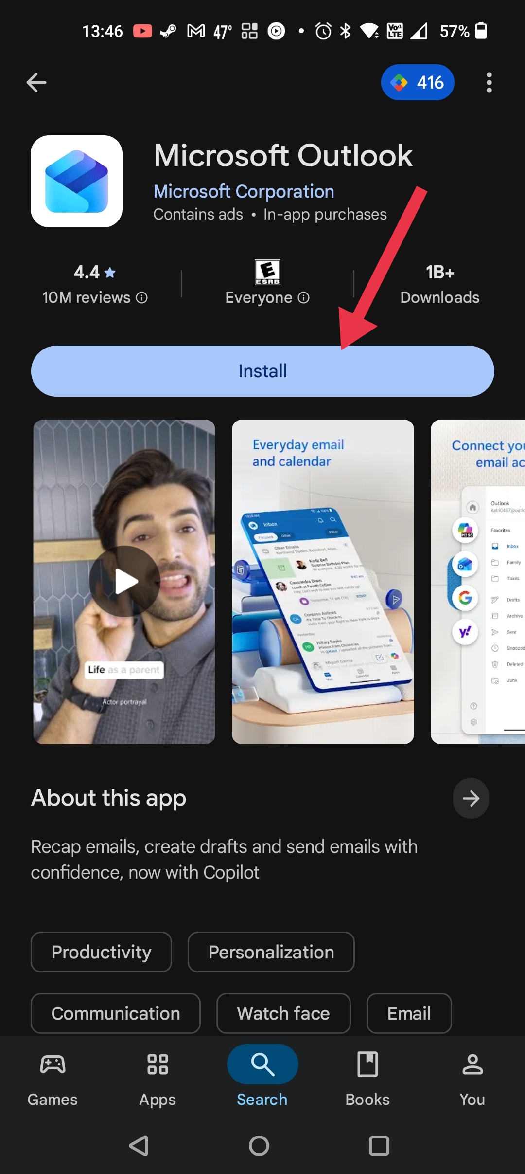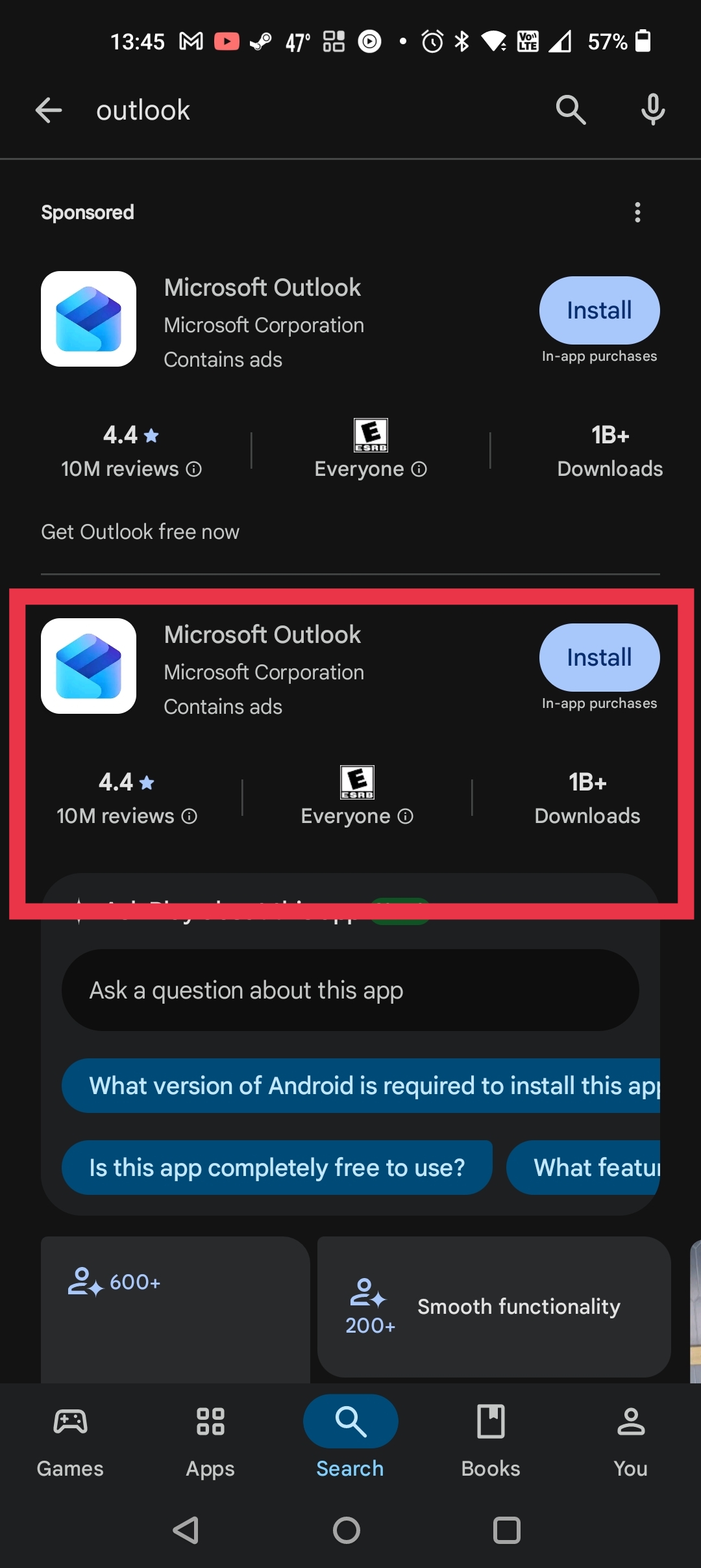 - Open the Play Store, search and download the Outlook app. Ensure the developer is the Microsoft Corporation. Direct Link: https://play.google.com/store/apps/details?id=com.microsoft.office.outlook&hl=en_US&pli=1
