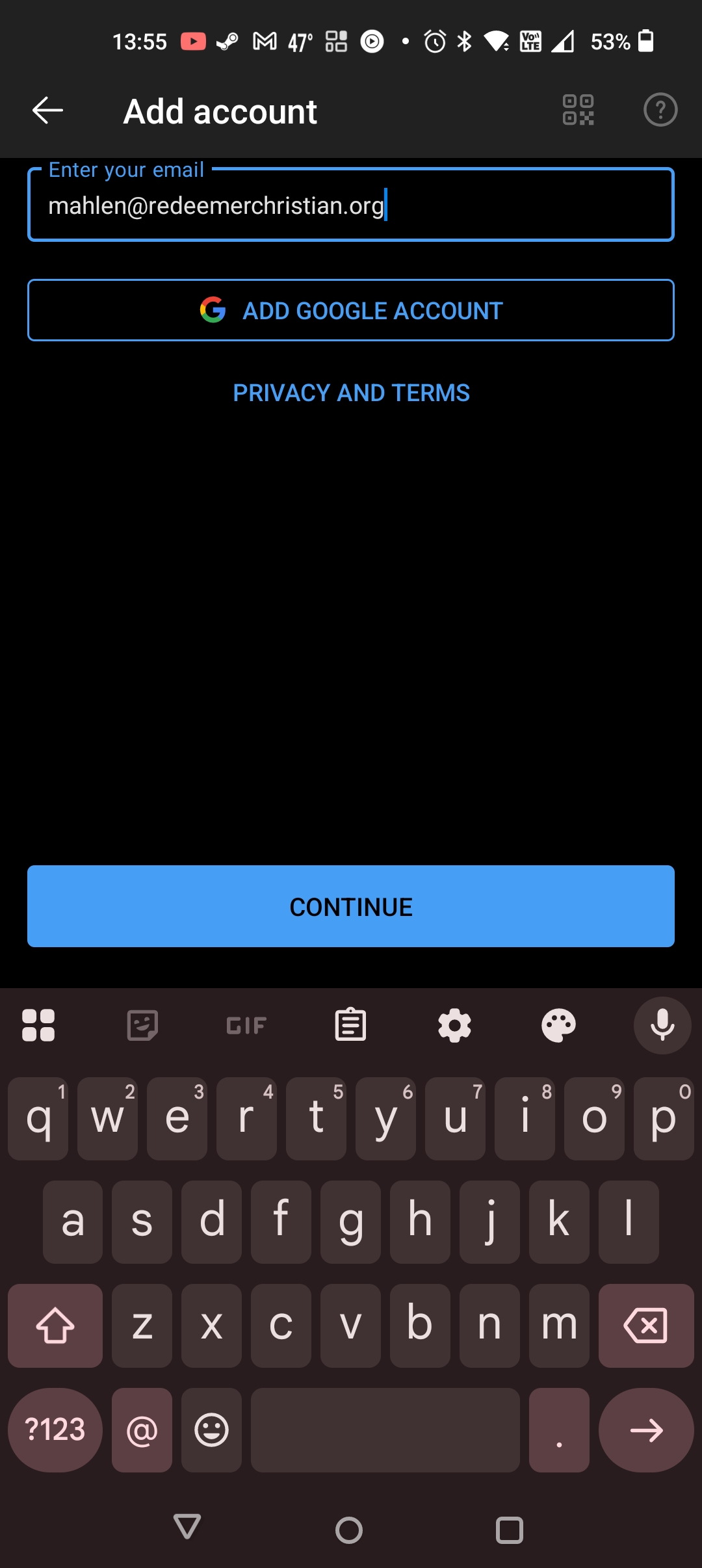 - Type in your issued email address and select Continue.